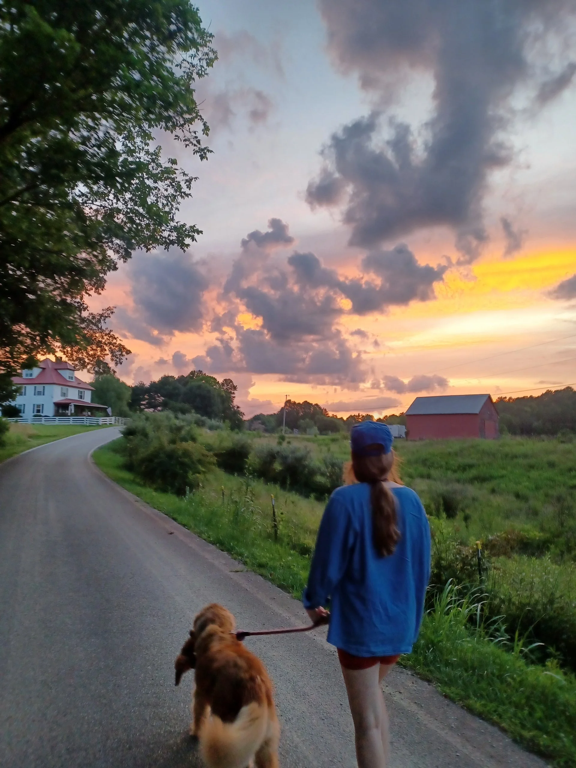 A person walking a dog on a rural road at sunset, with green fields, trees, a white house, and a red barn under a colorful sky with clouds.