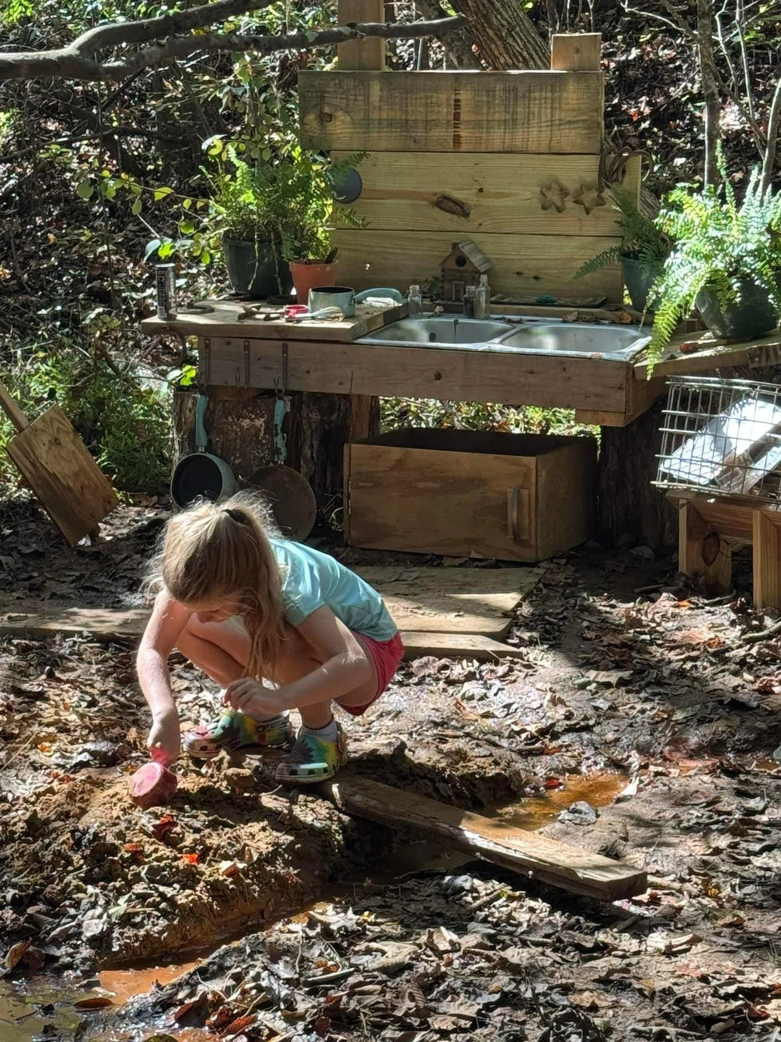A young girl kneeling on the ground near a small wooden outdoor sink setup in a wooded area. She is playing with soil or mud, wearing a light blue shirt, red shorts, and colorful shoes. The sink workspace is made of wood, with plants on either side,