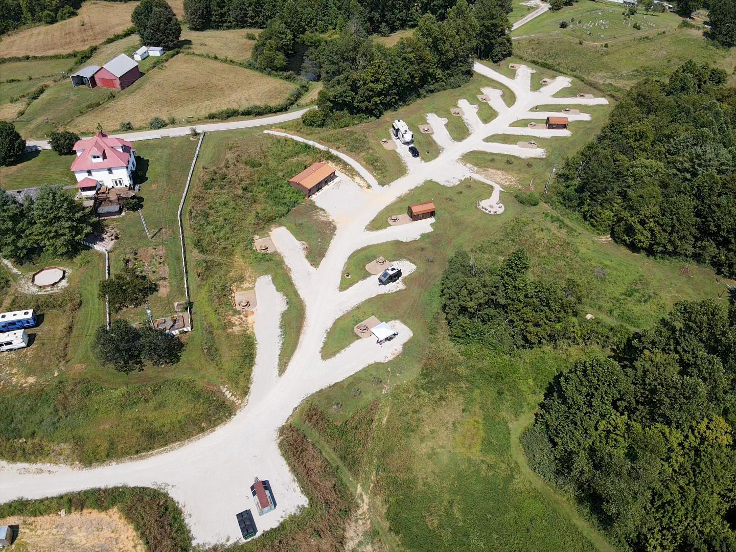 An aerial view of a rural area with winding gravel roads, small wooden structures, a large house with a pink roof, and surrounding green trees and fields.